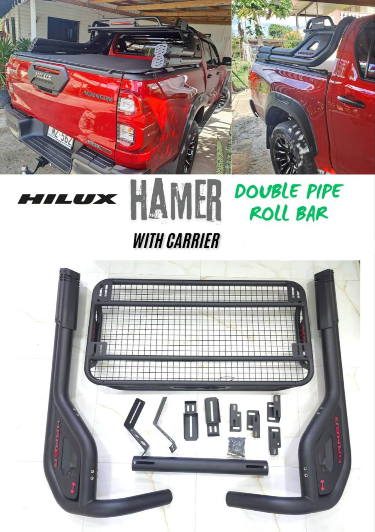 Upgrade your Toyota Hilux with the premium HAMER Double Pipe Roll Bar with Carrier, designed to deliver both rugged style and enhanced functionality. Built for off-road enthusiasts and adventure seekers, this roll bar not only improves the vehicle’s aggressive appearance but also adds practical utility for carrying gear.